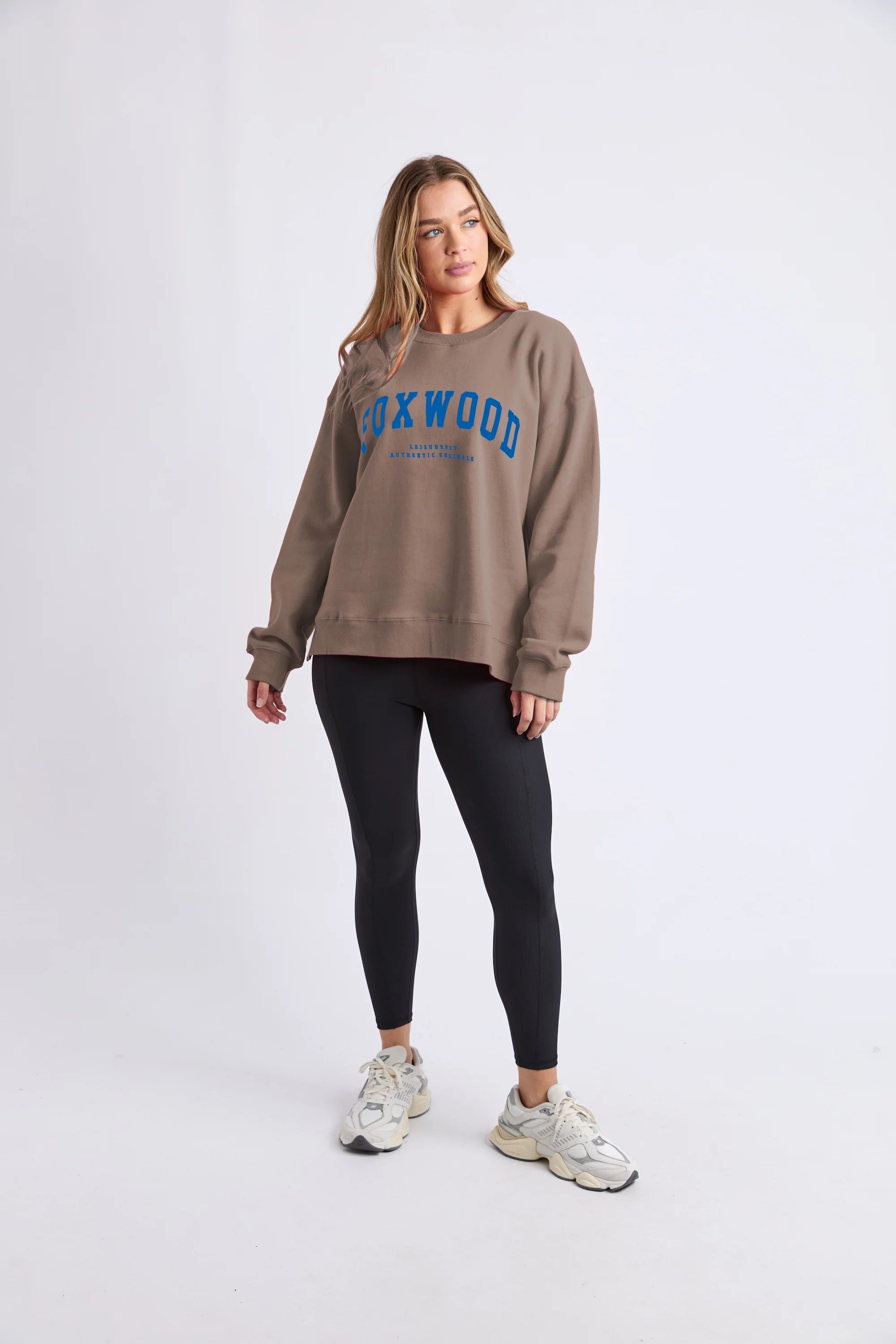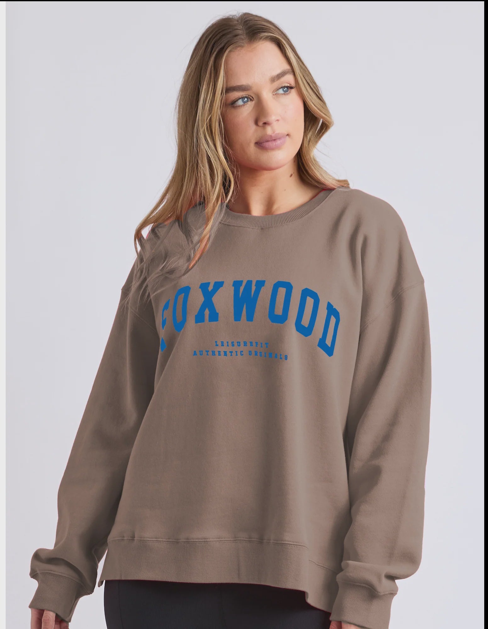 The Foxwood Interval Crew combines relaxed comfort with refined style. Featuring an oversized silhouette, ribbed detailing, and an extended back hem with side splits, this cotton blend crew works seamlessly from weekend lounging to elevated casual outings. Bold blue lettering on a rich brown base makes a quiet statement, while the soft fabric and unrestricted fit invite effortless layering and movement.