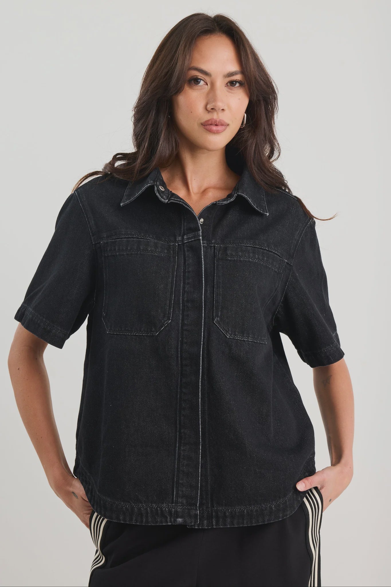 The Crucial shacket is that perfect blend of shirt and jacket, laid-back, structured, and totally cool. Crafted in washed black denim with short sleeves and chest pockets, it brings a touch of utility edge to any outfit. The Crucial Shacket is made to be styled your way, open, buttoned, or layered.