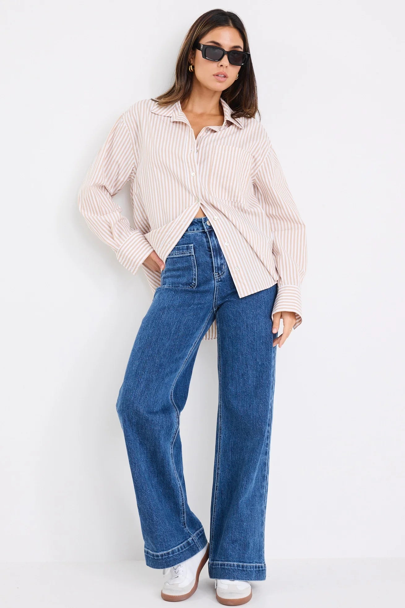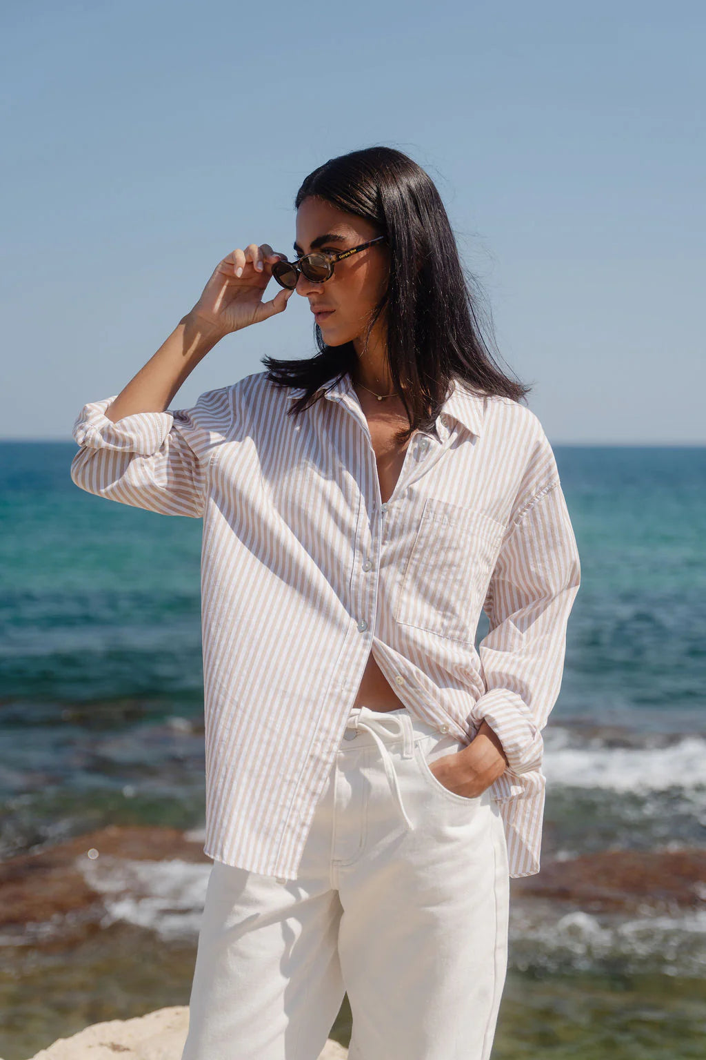 Effortlessly elevate your style with our fresh take on a classic button-up. The modern chocolate and white pinstripes add a touch of sophistication, while the lightweight fabric keeps you comfortable. Whether worn loose or tucked in, this versatile shirt is perfect for both polished office wear and casual weekends.