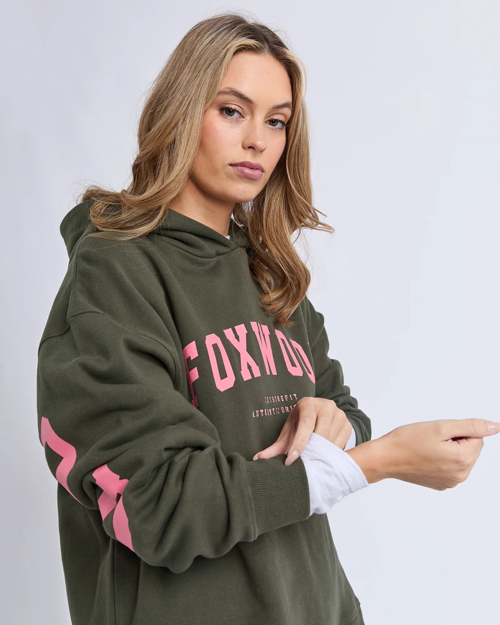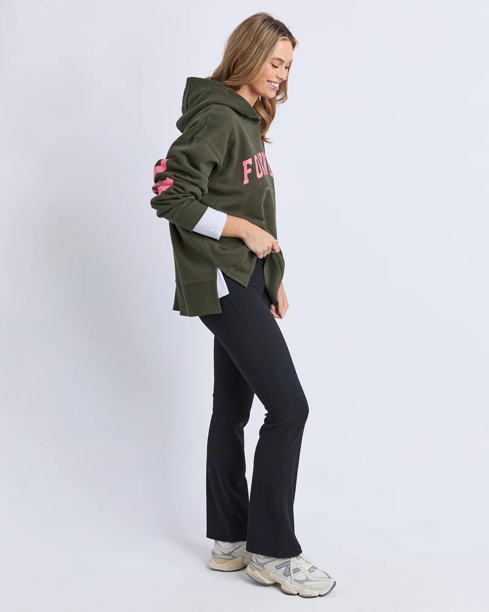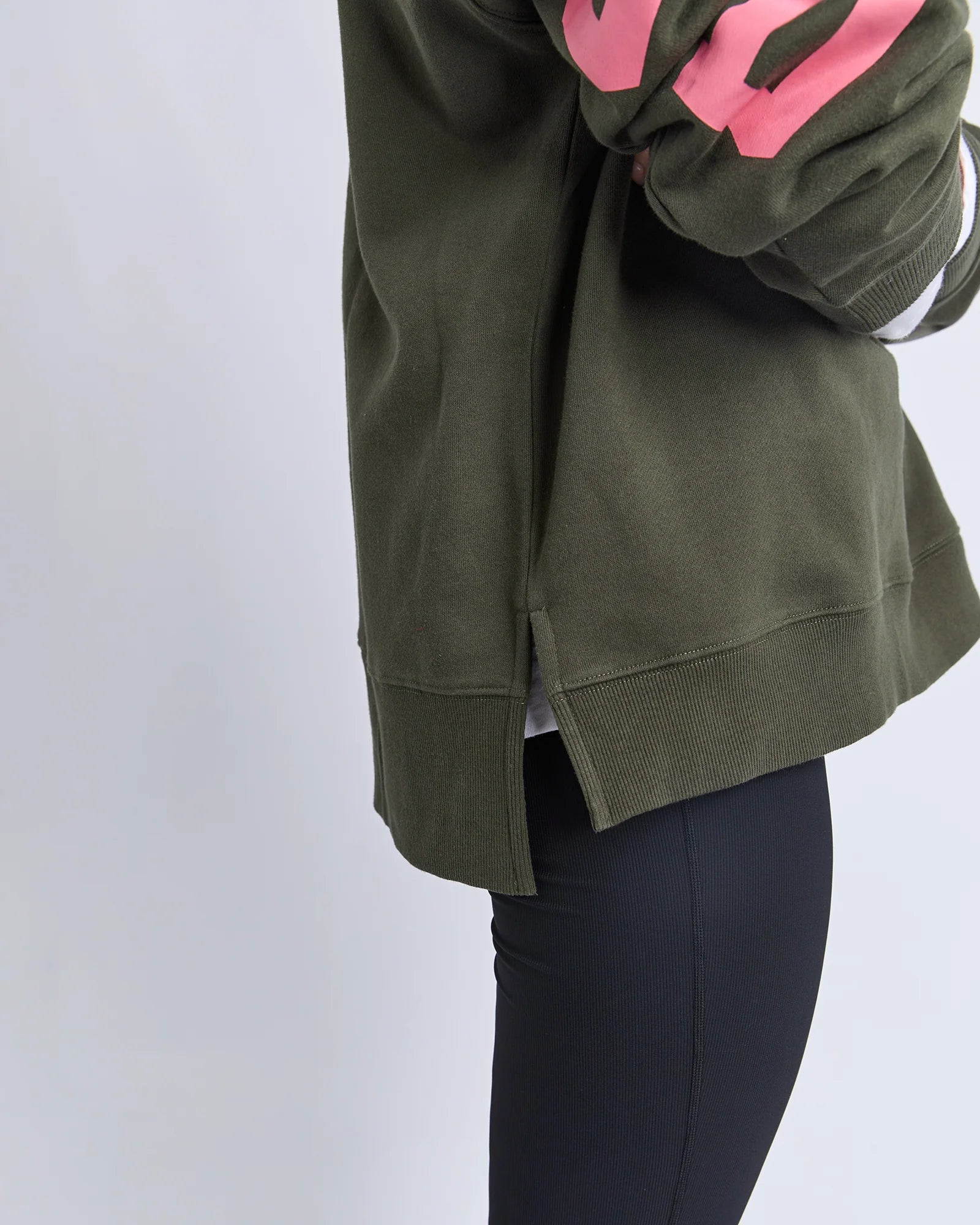 A khaki base paired with bold pink lettering creates an easy statement piece that feels both playful and versatile. The slightly longer back hem and side splits add movement and shape, making it ideal for layering through cooler days or styling solo for relaxed weekend dressing. Pair with joggers for off-duty comfort or style with denim and chunky trainers for an elevated casual look.