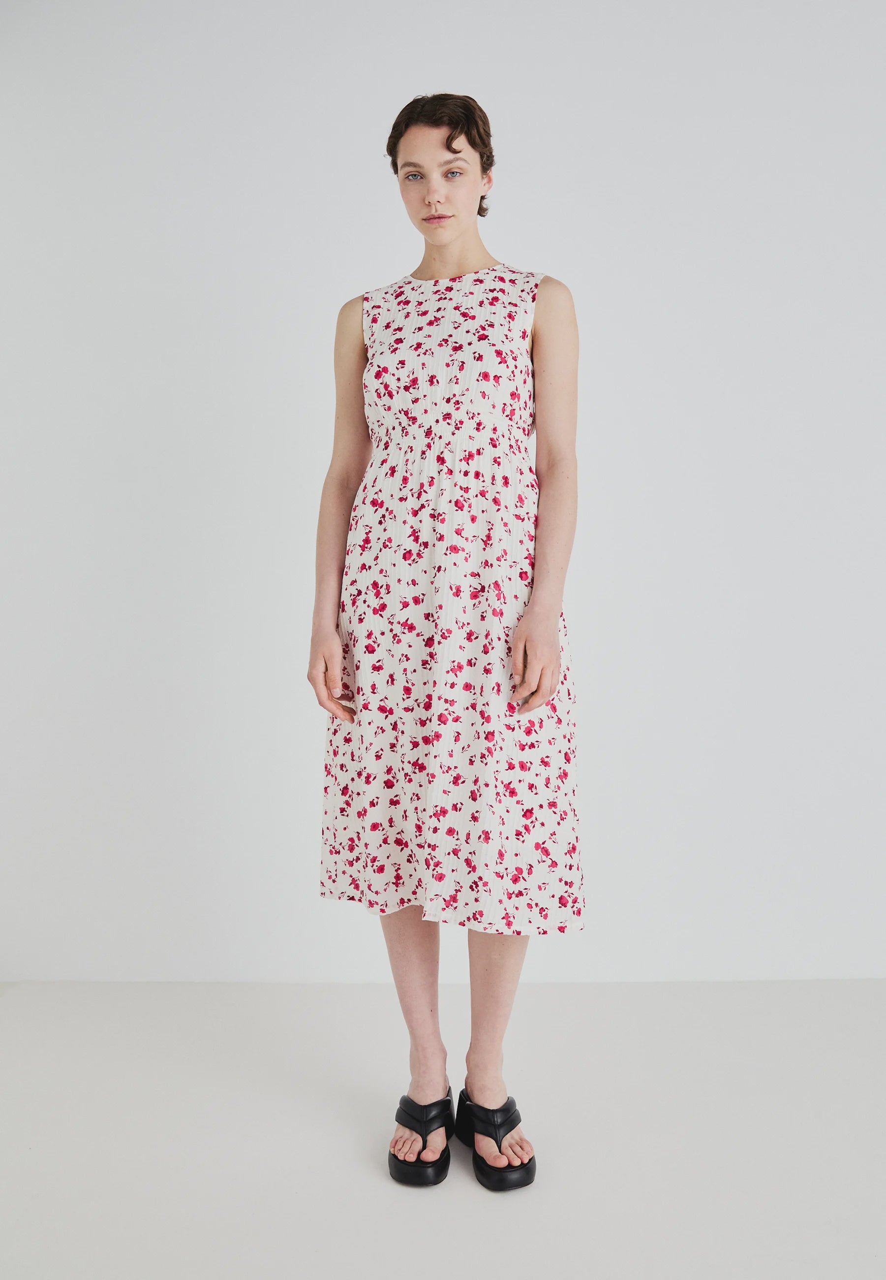 Elevate your wardrobe with the Falisha sleeveless dress, featuring a chic floral pattern and a flattering calf-length silhouette. Crafted from a luxurious blend of 80% Viscose and 20% Polyamide with a smooth viscose lining, this dress offers both comfort and elegance. Its classic crew neckline, inseam pockets, and slip details make it perfect for sophisticated occasions or casual outings. Designed for a regular fit with a fitted shape, it’s a versatile addition to any wardrobe.