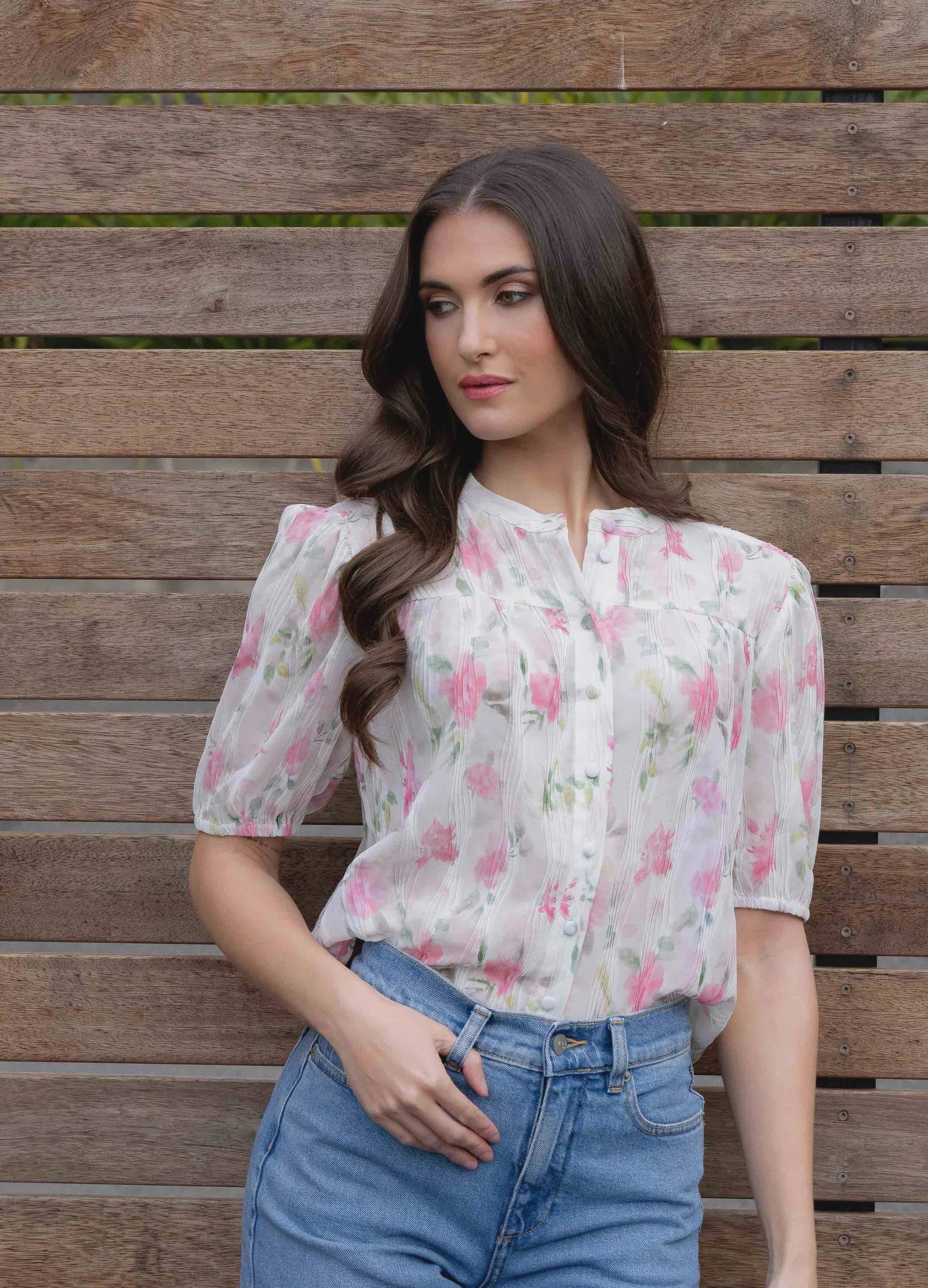 Light, feminine, and effortlessly chic the Seeking Lola Fluent Shirt Short Sleeve Top in Crinkle Blossom Print is a romantic update to your everyday wardrobe. Crafted from a soft, sheer fabric with delicate pleats and puffed short sleeves, it showcases a beautiful pink floral print that feels timeless yet fresh. Designed for versatility, this blouse layers seamlessly over a cami or can be worn as-is for an airy, polished look. Pair it with denim for casual elegance or style it with skirts for a more elevated outfit.