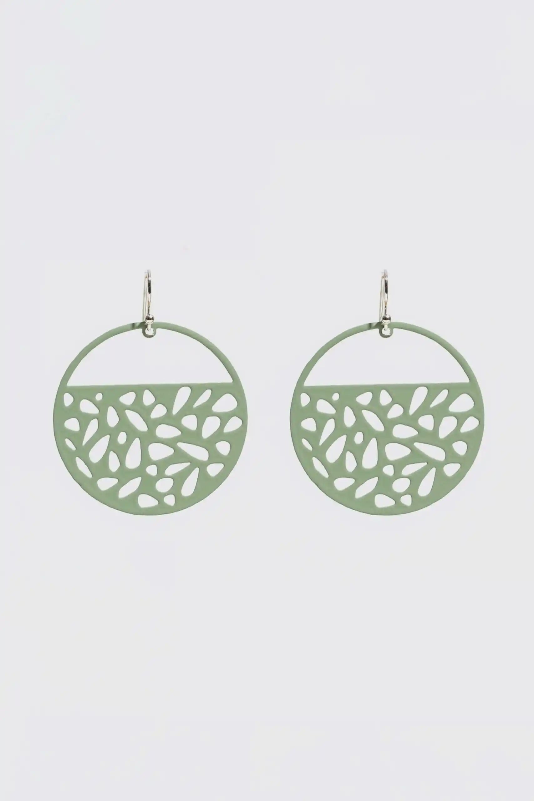 Bring a fresh twist to your accessory collection with these playful circular hook earrings in a beautiful sage green. Their on-trend laser-cut design adds a charming touch of detail, making them perfect for adding a splash of color and personality to any outfit. Lightweight and fun, they’re ready to brighten your day!