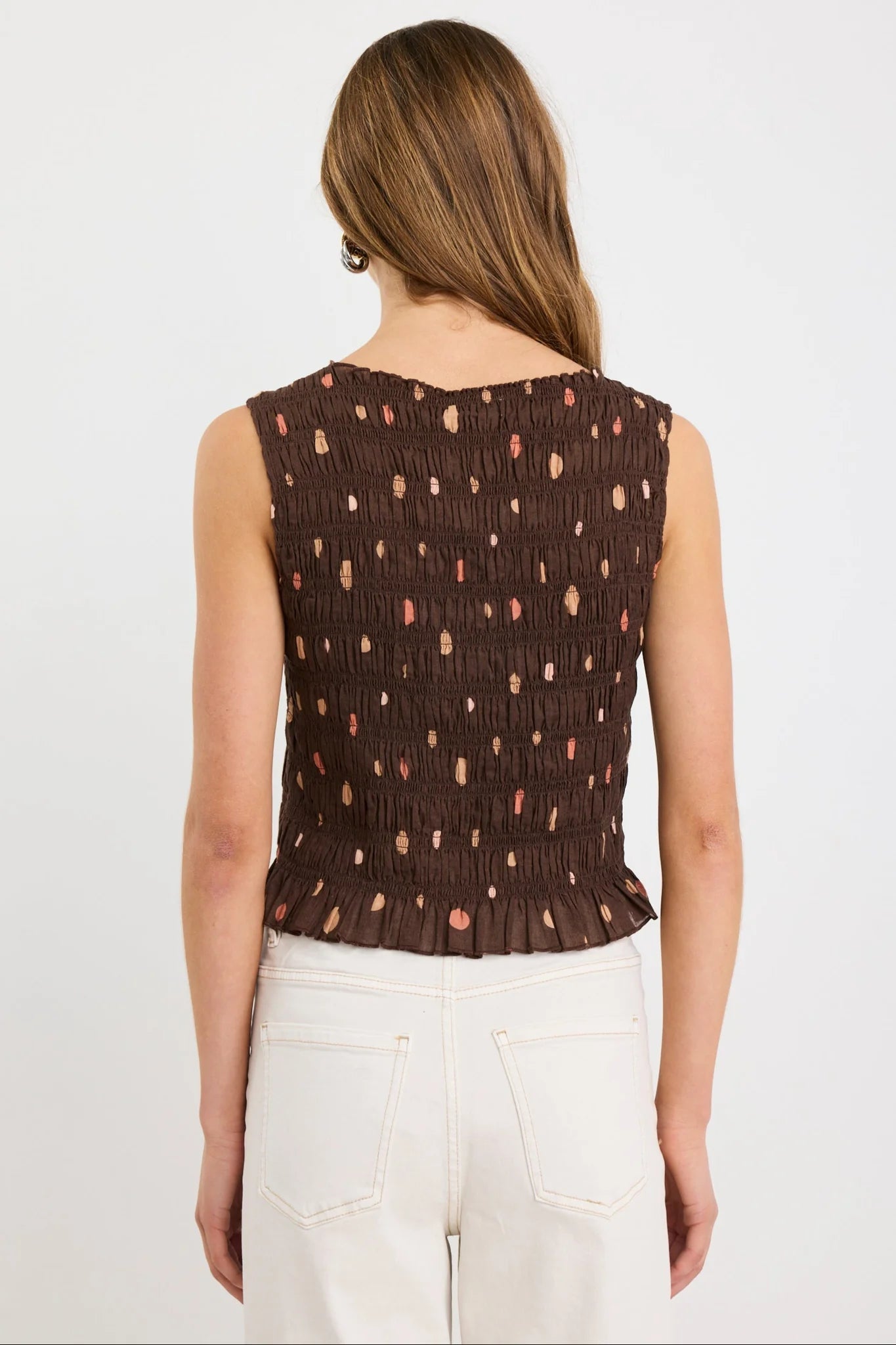 Pretty and playful, the Forsaken Chocolate Multi Polka Dot Shell Top adds effortless charm to everyday styling. Designed with all-over shirring, it offers a close, flattering fit while remaining light, breathable, and comfortable. The multi polka dot pattern brings a fresh, feminine feel, while the frilled hemline adds a delicate finishing touch. Perfect with denim, tailored pants, or skirts, this sleeveless shell is an easy warm-weather favourite.