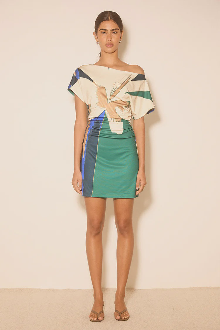 Make a statement in this exclusive Mini Dress, designed to flatter from every angle. Crafted from a double knit ponte fabrication, this dress offers a smooth, structured feel with just the right amount of stretch. The skimming fit-and-flare silhouette enhances your shape, while flattering side waist ruching adds definition. Featuring a wide multiwear neckline and grown-on short sleeves, this pull-on style is finished with a beautifully placed handcrafted floral print for an elevated, feminine look—perfect for day-to-night dressing.
