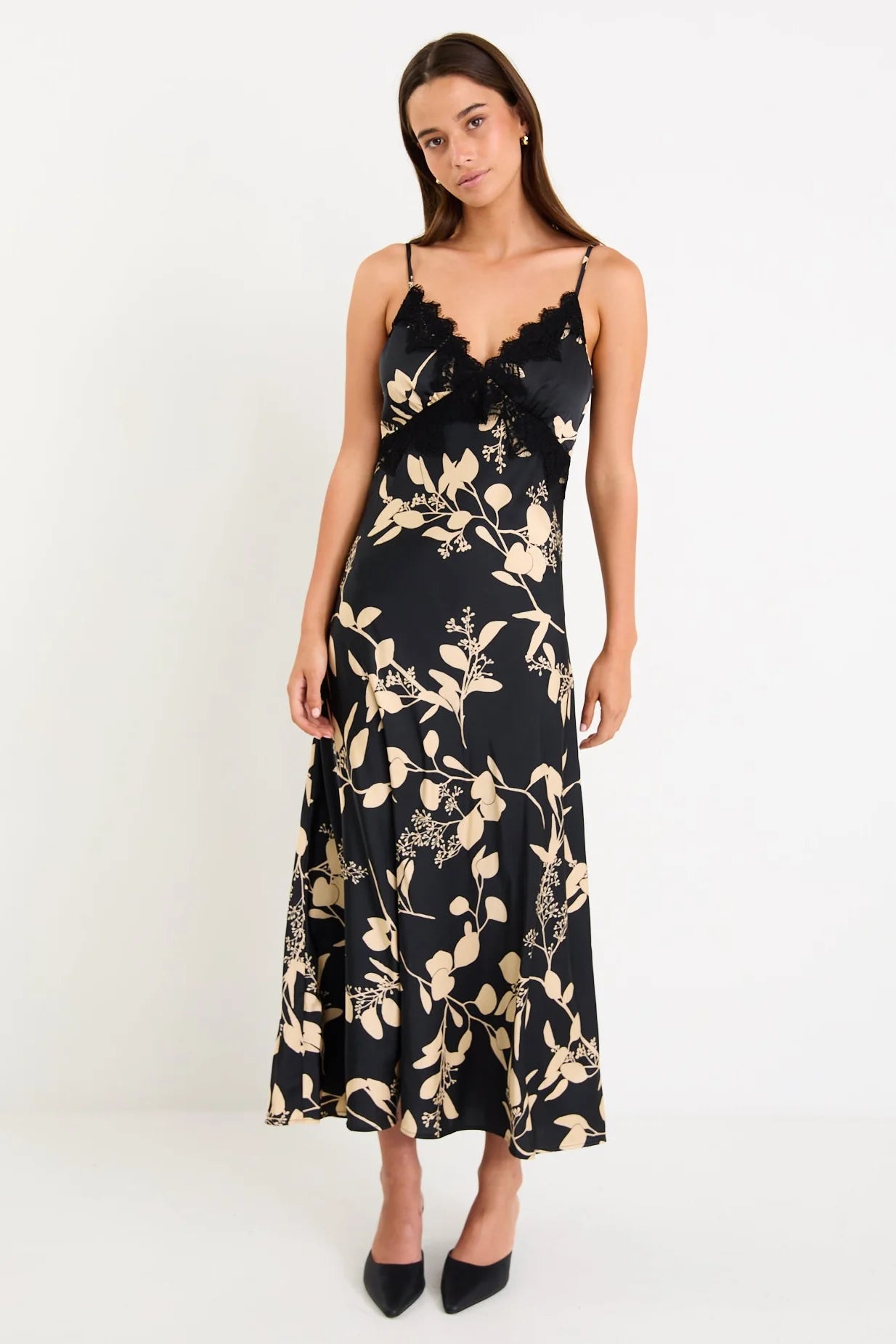 Effortlessly elegant and endlessly wearable, this floral bias cut midi dress is designed to flatter and flow with every step. Cut on the bias to gently skim the body, it creates a beautifully feminine silhouette while the delicate straps and lace-trim neckline add a soft, romantic finish. The dark floral print brings timeless sophistication, making it perfect for day-to-night styling. Pair with heels for special occasions or style with a blazer and flats for an elevated everyday look.